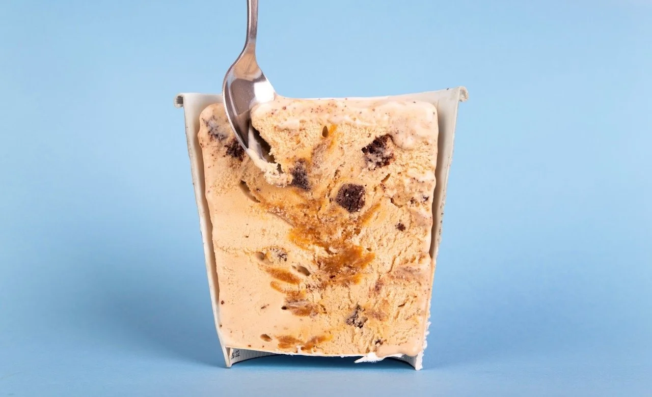 Salted caramel dairy ice cream container with caramel pieces and a gold spoon on white cloth with an orange blanket.