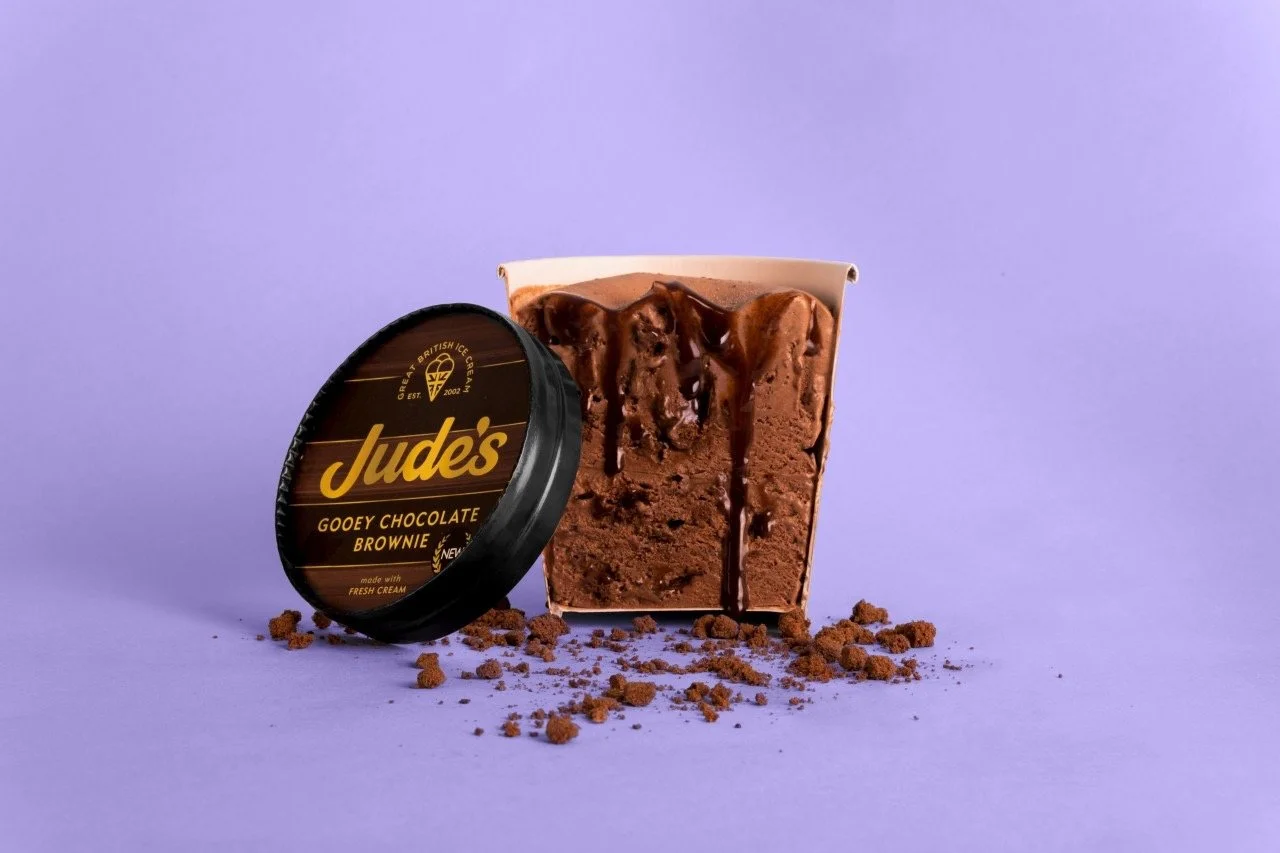 A container of Jude's gooey chocolate brownie ice cream with fudgy chocolate topping, open and showing the ice cream, with brownie crumbs scattered around on a purple background.