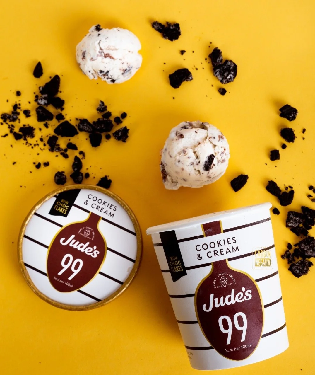 Ice cream containers labeled Jude's 99 Cookies & Cream with chocolate flakes, two scoops of cookies and cream ice cream, and scattered cookie crumbles on a yellow background.
