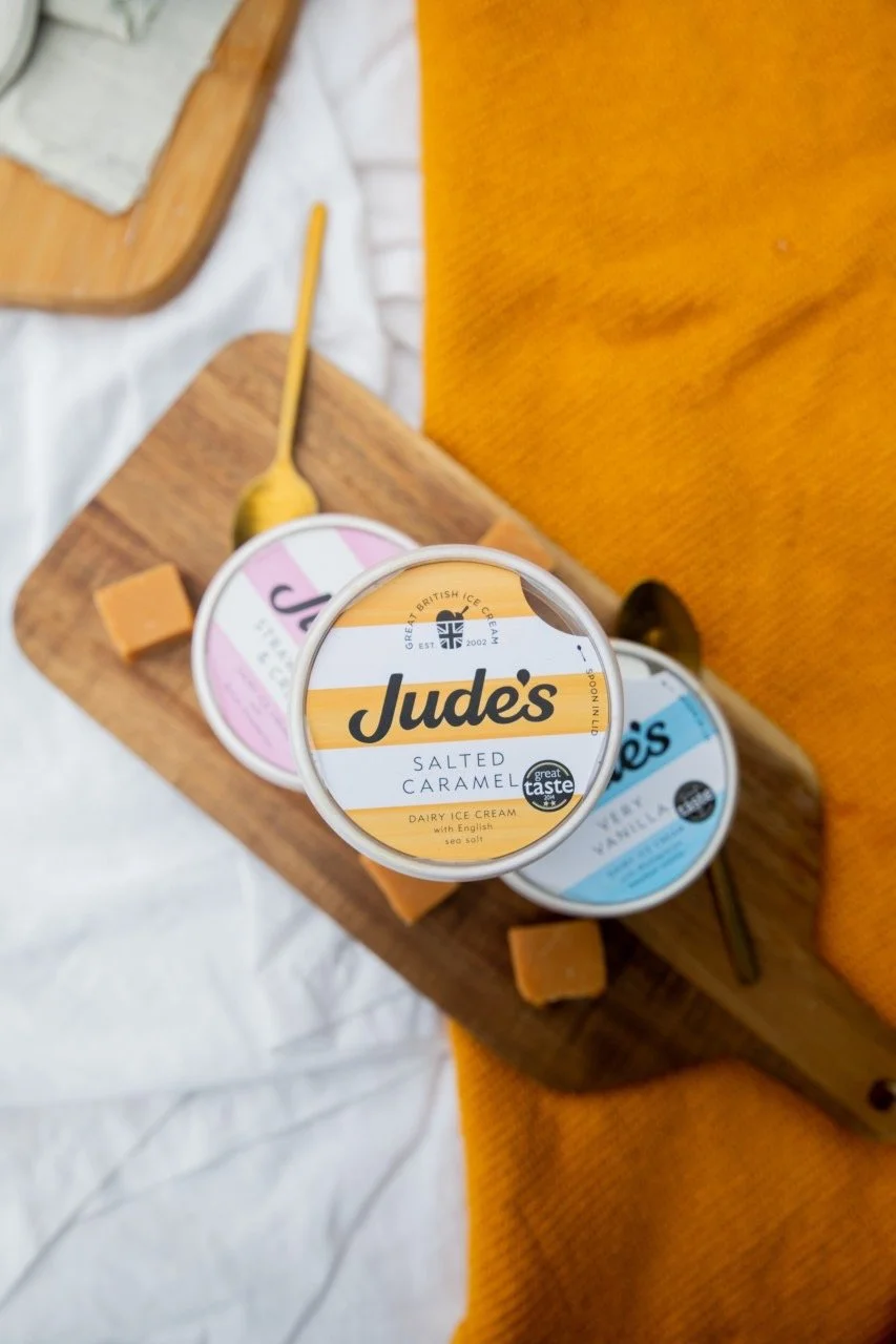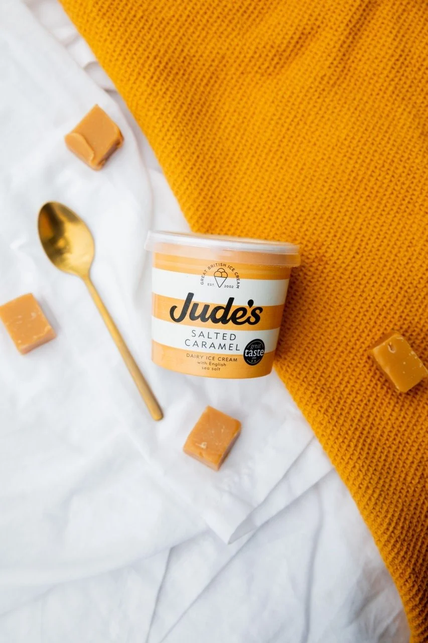 Top view of Jude's salted caramel and vanilla dairy ice cream containers on a wooden serving board with caramel candies and gold spoons, placed on white fabric and mustard-colored cloth.