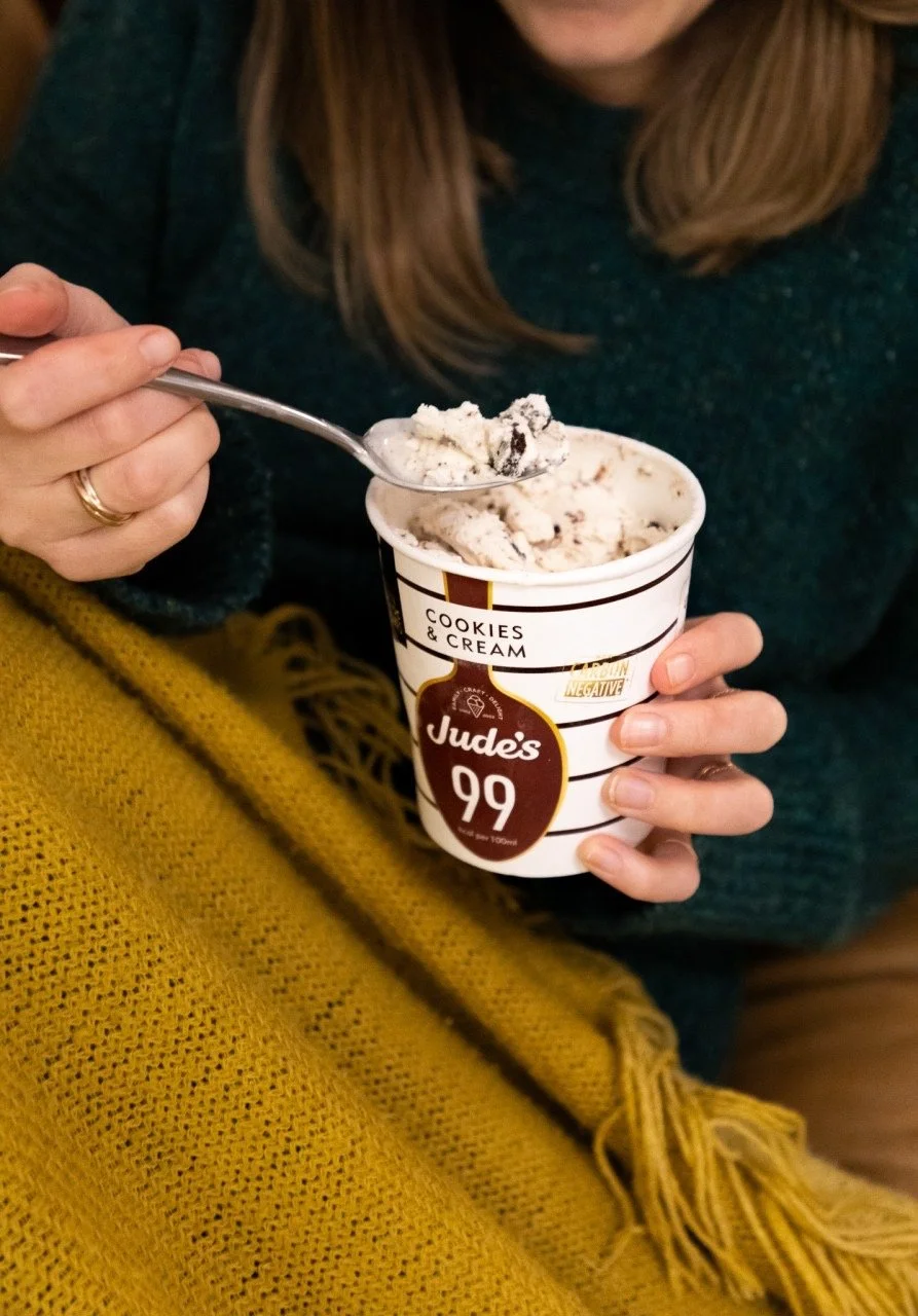 A person holding a cup of ice cream with chunks, labeled Jude's 99 Cookies & Cream, wearing a dark sweater, and a gold ring on their left hand.