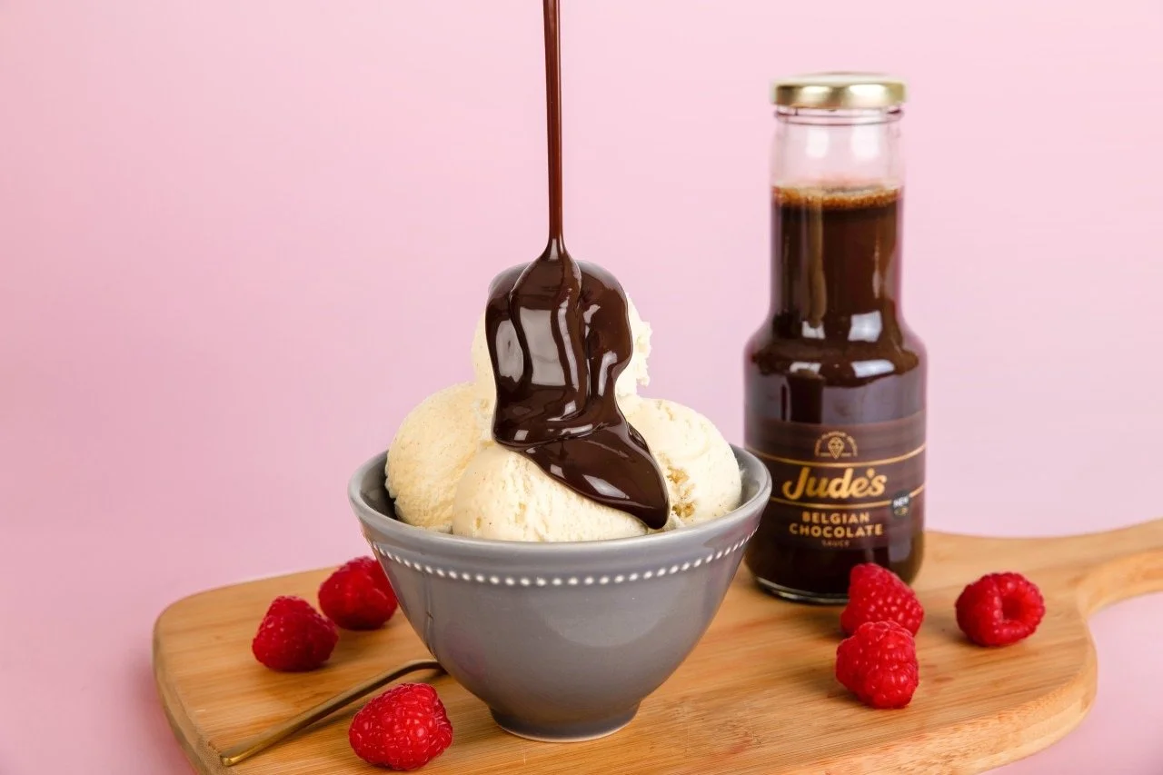 Vanilla ice cream in a gray bowl topped with chocolate syrup, surrounded by raspberries on a wooden tray, with a jar of Jude's Belgian chocolate syrup in the background against a pink backdrop.