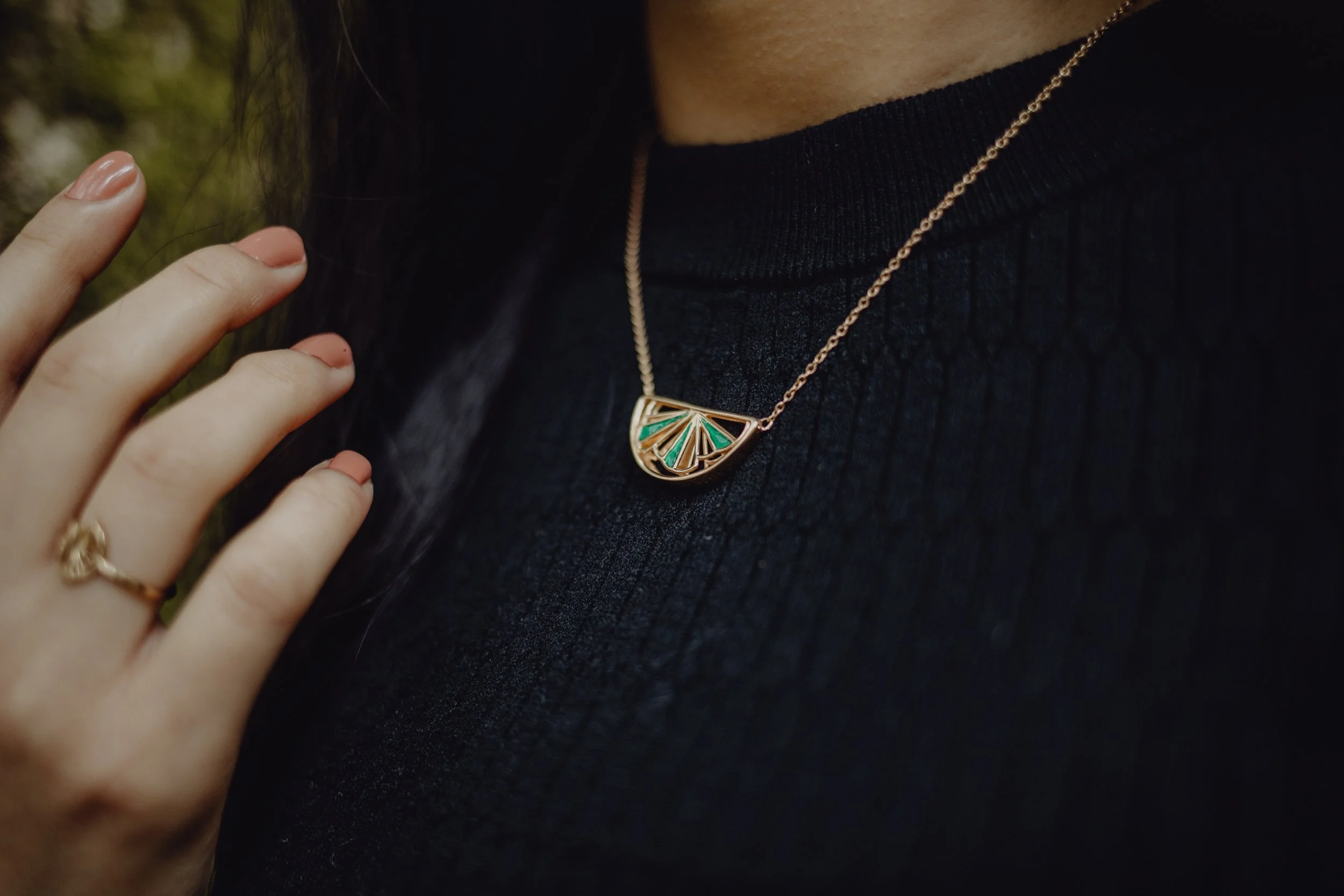 A woman wearing a black top, gold necklace with a green and gold fan-shaped pendant, and a gold ring on her finger with her hand near her neck.